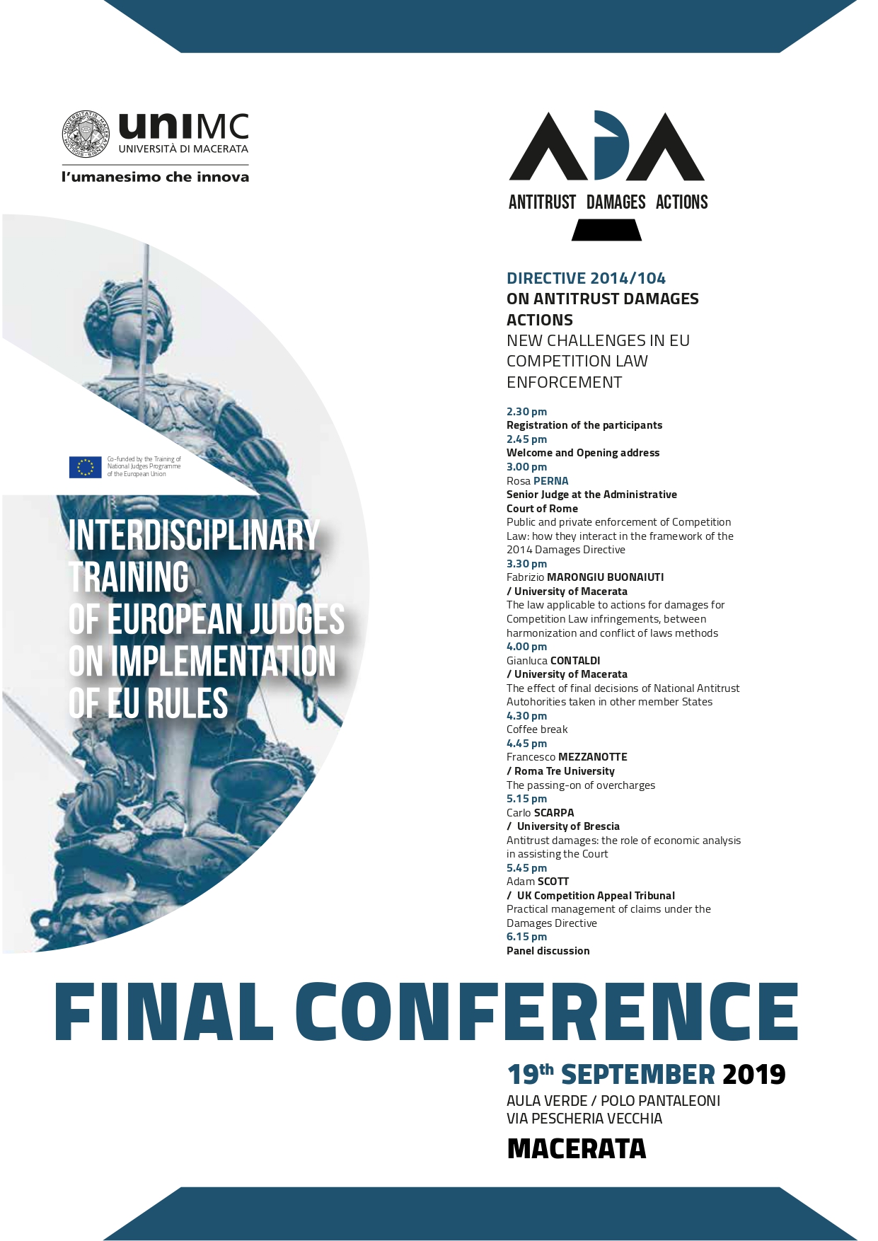 Il 19 settembre 2019 si terrà la conferenza finale del progetto A.D.A. Antitrust Damages Actions, progetto di formazione interdisciplinare indirizzato ai giudici europei riguardante l’applicazione e l’interpretazione del diritto comunitario della concorrenza. La conferenza verterà sul tema Directive 2014/104 on antitrust damages actions: new challenges in EU competition law enforcement.